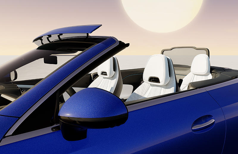 纯电机驱动的隔音织物软顶篷 - 敞篷轿跑车所专有的隔音织物软顶篷首次采用了纯电机驱动的开合机构,令开关过程更加宁静,于不动声色间撩人动心;顶篷合上,沉醉于静谧的优雅,顶篷打开,尽享随风舞动的自由。