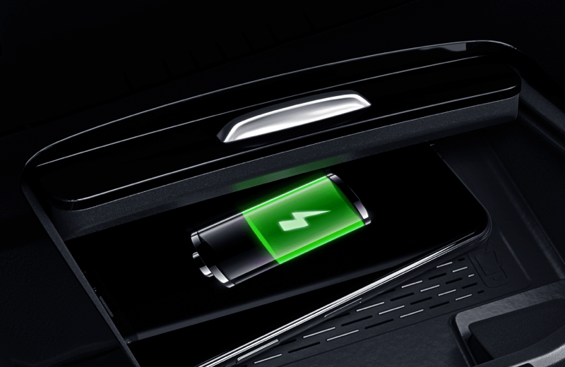 前排用于移动设备的无线充电功能 - 随车安装的无线充电设备,支持所有符合Qi标准的手机。驾驶时间就是充电时间,随手一放,立马蓄上。